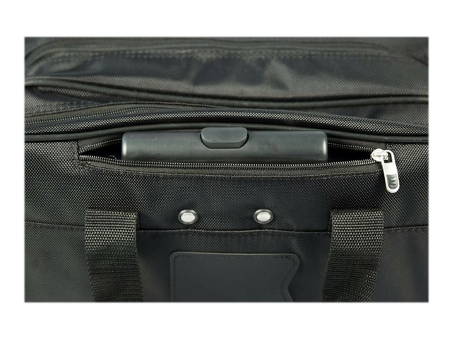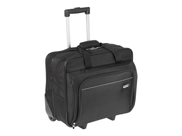 La mallette Targus Rolling Laptop Case a ete concue pour recevoir des ordinateurs portables equipes d'un ecran allant jusqu'a 16". Le rembourrage en mousse a cellules fermees protege votre ordinateur portable et le materiau en polyester 1200D durable et resistant a l'eau maintient vos affaires au sec dans les intemperies. Le poste de travail avant a fermeture eclair descendante comprend des porte-stylos, un porte-cartes de visite, une poche zippee, une pochette pour telephone portable et une grande poche pour ranger les autres accessoires. La mallette Rolling Laptop offre egalement un grand compartiment zippe pour ranger vos fournitures ou vos vetements pour les deplacements de courte de duree. La poignee telescopique se retracte dans le compartiment zippe quand elle n'est pas utilisee et la mallette est dotee d'une double poignee de transport pour plus de commodite. La Rolling Laptop Case est une mallette de voyage fonctionnelle concue pour les professionnels en deplacement.