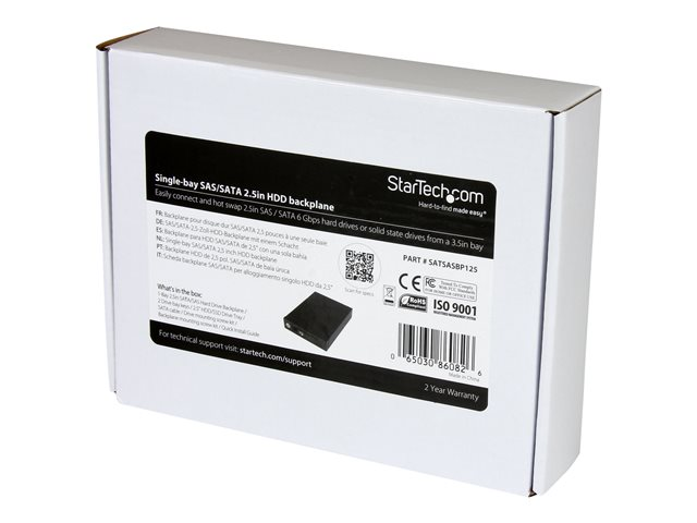 Il est désormais facile d'augmenter les capacités de stockage de votre serveur ou de votre PC tout en protégeant l'intégrité des données. Grâce à ce backplane à une baie pour rack mobile, il vous sera facile d'installer et de retirer un SSD ou HDD SATA ou SAS de 2,5 pouces dans une baie d'extension externe de 3,5 pouces de votre PC ou de votre serveur. Une solution sur mesure pour les intégrateurs de système et les administrateurs de système à la recherche d'une gestion flexible du stockage de données. La compatibilité en toute simplicité Le  backplane constitue une manière facile et pratique d'installer des lecteurs et de les échanger à chaud entre des ordinateurs de bureau ou des serveurs. Il accepte les lecteurs SAS et SATA de 2,5 pouces d'une hauteur entre 5 et 15 mm. Afin que vous puissiez tirer le maximum de vos disques durs, le rack mobile prend en charge les normes SAS II et SATA III pour donner des vitesses de transfert pouvant atteindre 6 Gb/s lors de l'utilisation avec un contrôleur compatible. Le backplane se monte à la verticale ou à l'horizontale, ce qui permet une insertion sans erreur et une compatibilité maximale avec n'importe quel serveur ou ordinateur de bureau. Il est possible de verrouiller le tiroir amovible en acier pour mieux protéger le lecteur. Le connecteur Non-Scratch SATA (NSS) assure un service nominal de plus de 50 000 branchements. Voici un gage de durabilité, à la fois pour le disque et pour la baie. Tiroirs de lecteurs pratiques et interchangeables Dans maints milieux de travail au rythme effréné, il est nécessaire de retirer les disques régulièrement. Ce backplane pratique facilite un échange à chaud rapide entre des systèmes, sans mise hors tension. Le tiroir de lecteur inclus est interchangeable et fonctionne avec le backplane monodisque aussi bien qu'avec celui à quatre baies (SATSASBP425). Vous pourrez ainsi échanger à chaud entre des systèmes pour accéder facilement à vos fichiers. Format en métal ventilé durable Robuste et fait d'un métal de qualité supérieure, le boîtier propose un rendement fiable.  Le système de ventilation assure une bonne circulation d'air favorisant la dissipation de la chaleur. Le connecteur Non-Scratch SATA (NSS) assure un service nominal de plus de 50 000 branchements. Voici un gage de durabilité, à la fois pour les disques et pour la baie. Le backplane monodisque SATSASBP125 bénéficie de la garantie StarTech.com de 2 ans et de l'assistance technique à vie gratuite.
