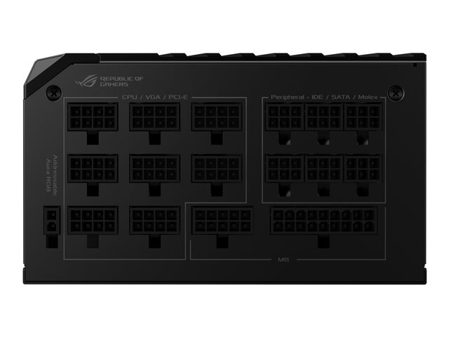 | Fonctions | Câbles à manchon, protection contre les surintensités, protection contre les surtensions, protection de surtension, protection de court-circuit, protection thermique, affichage OLED, entièrement modulaire, ASUS Aura Sync, refroidissement de 0 dB avec ventilateur à ailettes IP5X antipoussière, dissipateur thermique ROG |