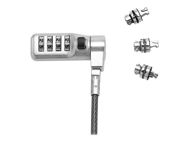 Parfait pour les sociétés qui travaillent avec différents appareils. Grâce au cadenas de sécurité à combinaison avec tête interchangeable (T-Lock, Wedge et Nano), votre cadenas correspond à tous types d'appareils équipés d'un port antivol. Simple, pratique et efficace. Ce verrou est utilisé dans un système de verrous supérieur qui permet l'accès aux utilisateurs et à l'administrateur du système grâce à un code prédéfini. Ce code prédéfini est programmé dans le verrou avant l'envoi pour que l'utilisateur puisse travailler immédiatement sans avoir à définir une nouvelle combinaison.