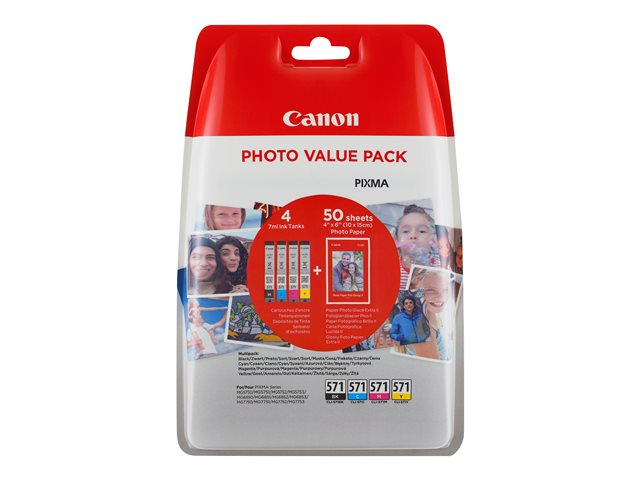 Canon CLI-571 C/M/Y/BK Photo Value Pack - Pack de 4 - 7 ml - noir, jaune, cyan, magenta - original - 100 x 150 mm 50 feuille(s) réservoir d'encre/kit papiers - pour PIXMA TS5051, TS5053, TS5055, TS6050, TS6051, TS6052, TS8051, TS8052, TS9050, TS9055