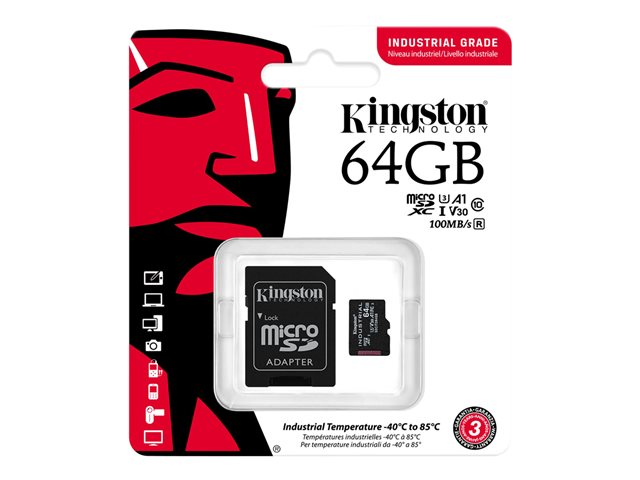 Kingston Industrial - Carte mémoire flash (adaptateur microSDXC vers SD inclus(e)) - 64 Go - A1 / Video Class V30 / UHS-I U3 / Class10 - microSDXC UHS-I