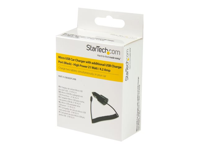 StarTech.com Chargeur voiture double - Adaptateur allume cigare avec câble Micro USB et port USB 2.0 - Haute puissance 21W / 4,2A - Adaptateur d'alimentation pour voiture - 21 Watt - 4.2 A - 2 connecteurs de sortie (USB, Micro-USB de type B) - sur le câble : Micro-USB - noir - pour P/N: USBLT1MW, USBLT1MWS, USBLT2MBR, USBLT2MW, USBLT30CMW, USBLTM1MBK, USBLTM1MWH USBUB2PCARB