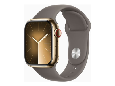 Apple Watch Series 9 (GPS + Cellular) - 41 mm - acier inoxydable doré - montre intelligente avec bande sport - fluoroélastomère - argile - taille du bracelet : S/M - 64 Go - Wi-Fi, LTE, UWB, Bluetooth - 4G - 42.3 g