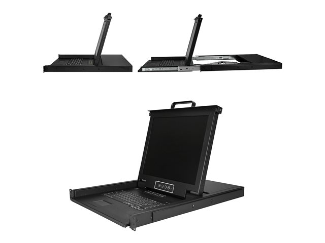 Cette console KVM à 16 ports permet de contrôler intégralement le clavier, l'écran et la souris de 16 ordinateurs. La console s'installe dans un espace de rack 1U, offrant une solution économe en espace pour un contrôle complet par la console.