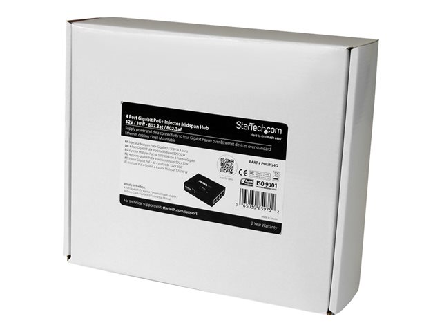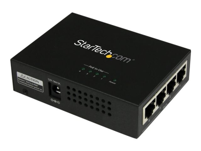StarTech.com Injecteur PoE+ à 4 ports Gigabit - Midspan Power over Ethernet à fixation murale - 802.3at/af - Injecteur de puissance - CA 100-240 V - 120 Watt - connecteurs de sortie : 4 - noir - pour P/N: POEEXT1GAT, POEEXT2GAT, ST12MHDLANU POEINJ4G
